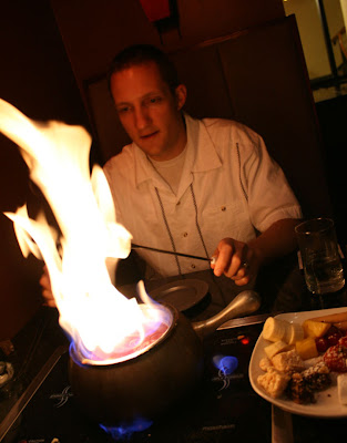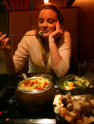 It was a four course meal. First, salads, but I forgot to take a picture- actually I inhaled it. Momma needs to eat. Then we got a cheese fondue with breads and fruits and veggies. Yum!