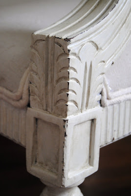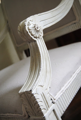 In an effort to bring the c-list chairs up to par with the a-list Ballard version, I started with sanding and painting the frames white (I used Valspar’s Honeymilk.)