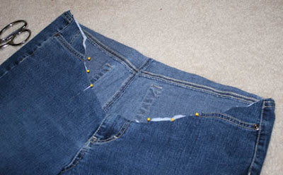 I then cut a band for the back, and sewed the sides together, and folded the bad side in and pinned them to the outside of the cut pants, like so: