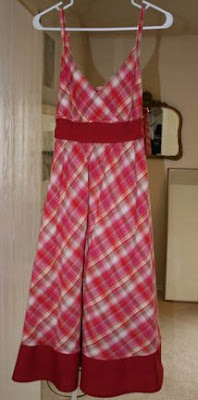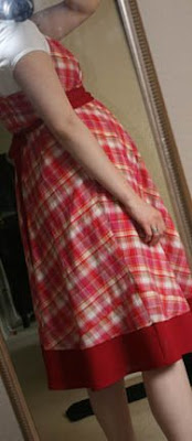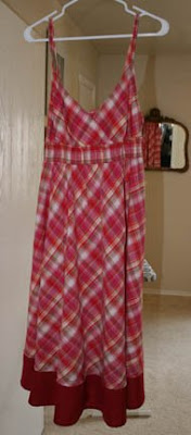 The first is a plaid summer dress from my sister. This is part of the maternity clothes collection that was passed to me! Yahoo! Only one problem, I am the tallest girl in the family, by 3 inches, to my tallest sister. Noelle who sent me this is 5’5″, so I really needed an extra 5 inches of fabric, in order to move around with out exposing myself. So here is what I did: