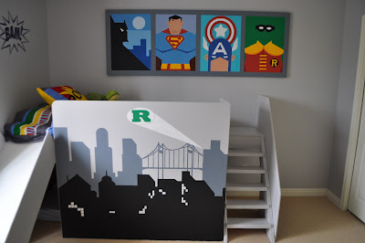 This superhero room is so cute. I love the blown up newspaper article!