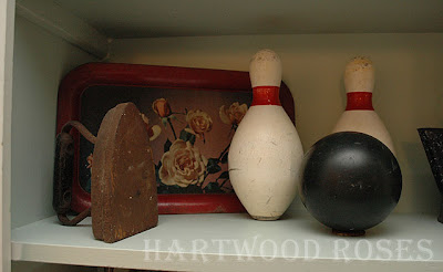 This shelf is a tribute to my dear friend Kat. I bought the duck pins while shopping with her one day at The Vintage Source. When the Husband and I were at Luckett’s picking up the cupboard, I spotted a basket of duck pin bowling balls, and I bought one for Kat and one for me. The rose tray was a gift from Kat … it had once been her mother’s, and she sent it to me knowing it would have a good home here. (I get teary just thinking about it.)