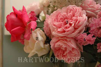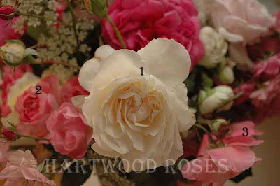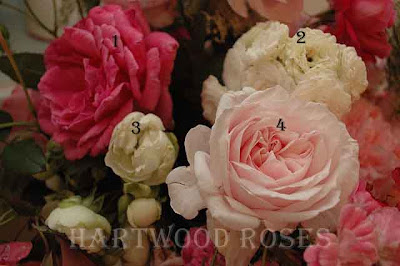 1. Not-September Morn, 2. Alba Meideland, 3. Snow White, 4. Souvenir de la Malmaisson.
