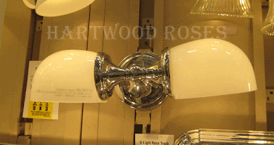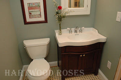 The vanity is brand new, and its mahogany finish and curvy porcelain top blend perfectly with the Vintage vibe I was going for in this room.