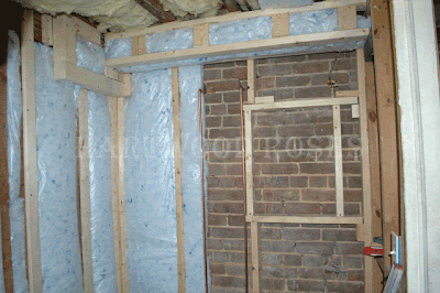 The sink wall, stripped to the original brick wall of the house, looked like this as we finished the framing and began to add insulation. All of those bulkheads were neccessary to conceal the new plumbing in the wallls.