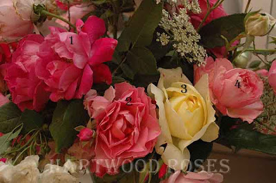 1. Wagon Wheel Bright Pink, 2. New Dawn, 3. Comtesse de Segur, 4. Gartendirektor Otto Linne, and some Queen Anne’s Lace.