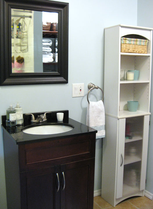 This sink/vanity from Lowes was the piece that started it all. I saw it one day while shopping and I liked the dark brown wood with black granite top and deep white sink. It was a good price and perfect size for the room. It is slightly smaller in width than the old vanity, which provides a little extra space left and right. The black framed mirror was a great find at Kirkland’s. I got it for $16 because it was the last one and had a tiny nick in it.