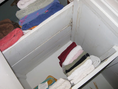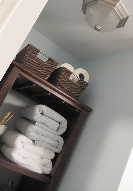 Perfect shelves to hold my new Pottery Barn pale blue and white towels. I had a field day picking out new towels, thanks to some gift cards from my Uncle Bob.