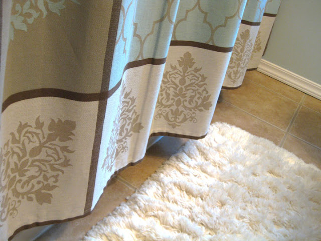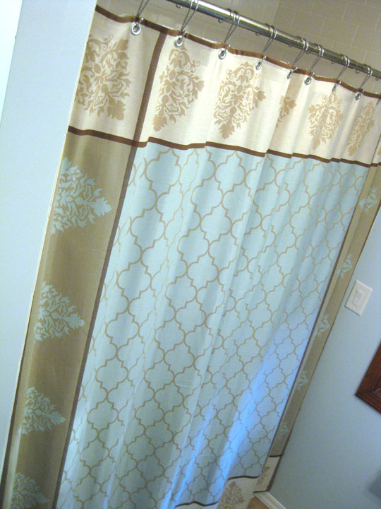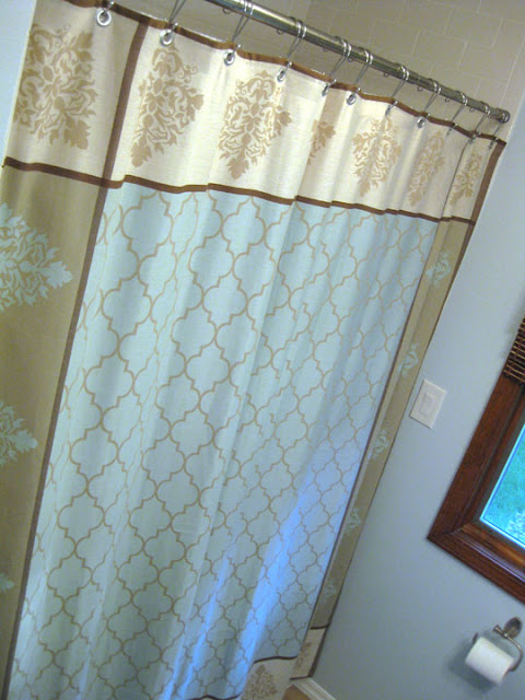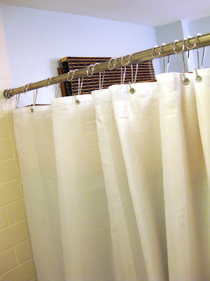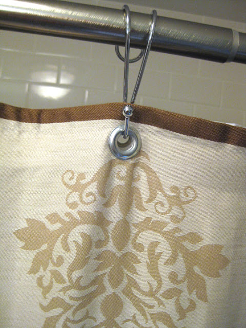 I used these great dual shower curtain hooks that my Mom gave me from JCPenny. They are also available at Bed Bath and Beyond.