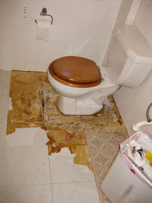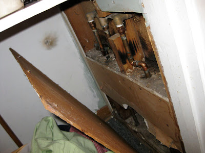 And exposed pipes and deteriorating wood below. Lovely.