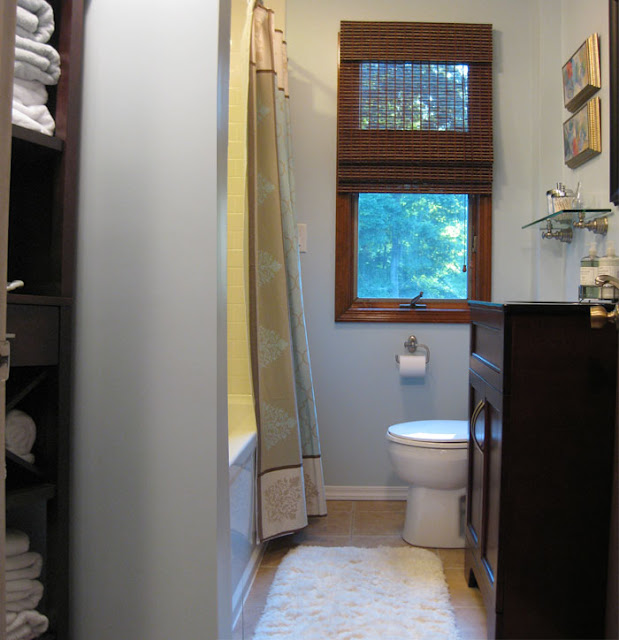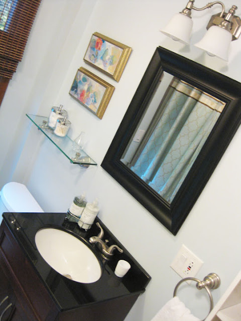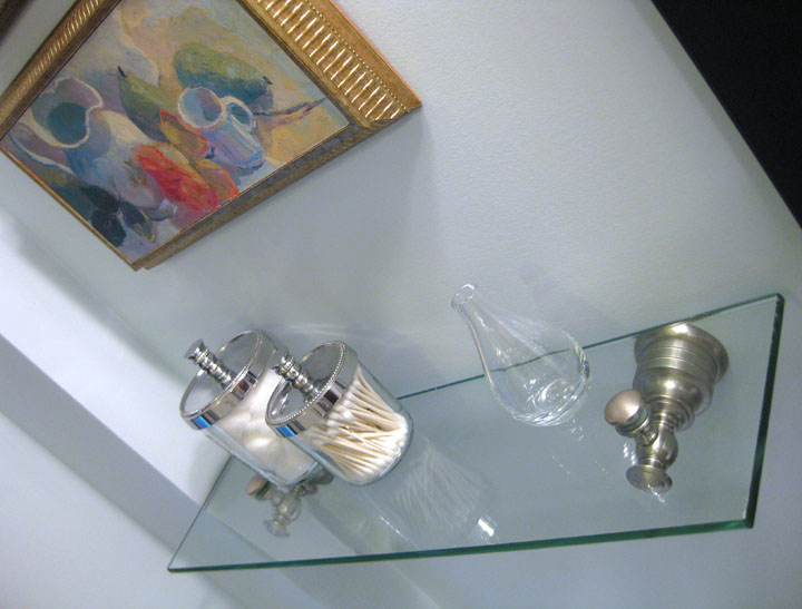 One final detail… I have been waiting to use this decorative glass shelf for 5 years. Seriously. I got this pretty shelf 5 years ago when I worked for Chase-Pitkin, a local home and garden chain. But I never had any where to put it. It finally has a home. I love how it adds to the “spa” feel and is both functional and decorative. Right beneath two little art paintings I had, originally purchased at Marshall’s for $5 each.