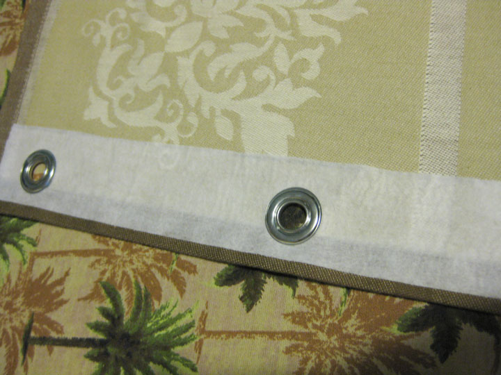 Cut a strip of interfacing, about two inches wide and as long as your curtain. Iron the interfacing strip to the BACK side of your soon-to-be-curtain at the very TOP. This will provide reinforcement for your grommets. (Don’t you love my palm tree ironing board cover?)