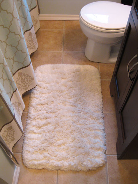 Here’s a look at the shower curtain border detail, baseboard trim and fluffy white rug. I also got the rug at Marshall’s, years ago and had not been using it. I like being able to utilize things I already have.