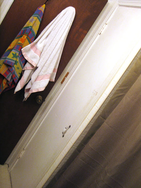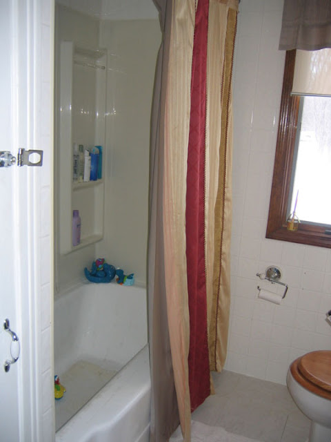 You can see the old white closet door, which collided with the room door when both were opened. Also, a look at the old tan colored plastic shower walls/shelves.