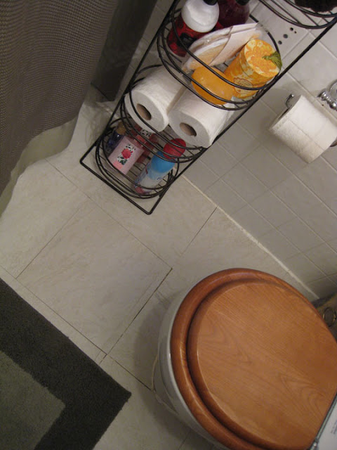 This is how I tried to dress it up and live with it for 2 1/2 years. I couldn’t even paint the walls though, because they were plastic tiles. The floor and the cracks drove me nuts because it just never looked clean, despite my rigorous cleaning efforts.