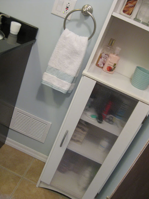 This tall narrow white shelving unit is the one piece we kept from the old bathroom. I purchased it at Christmas Tree Shops three years ago, when we first moved in. I love that it fits perfectly behind the bathroom door. As you can see, we store toiletries and extra supplies in the frosted cupboard.
