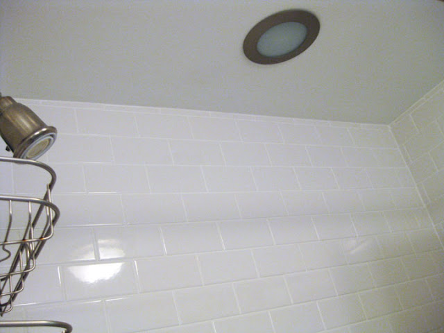 And the shower is just as great. Here is a look at the fruit of our labor, installing approximately 460, 3 inch by 6 inch white ceramic tiles. And one corner shelf. This was definitely the most challenging portion of the entire project, in my opinion. We had never tiled anything before. It was so time intensive, messy, and precise, with all of the cutting and measuring involved. I think it took a total of 5 nights after work, just to stick all of the tiles on. Then came the grouting and the sealing on the weekend. In the end, it was worth it, because it came out beautifully and looks really nice.