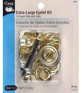 You will need some grommets, also known as eyelets. Joann Fabrics sells these little kits that come with little tools that you will need. I used extra-large rings. Just make sure they will fit over your shower curtain rings/hooks. Available in brass or silver, the kit comes with 10 grommets, but of course you need 12, so you will need to buy an extra pack of just grommets.