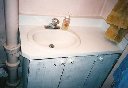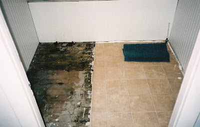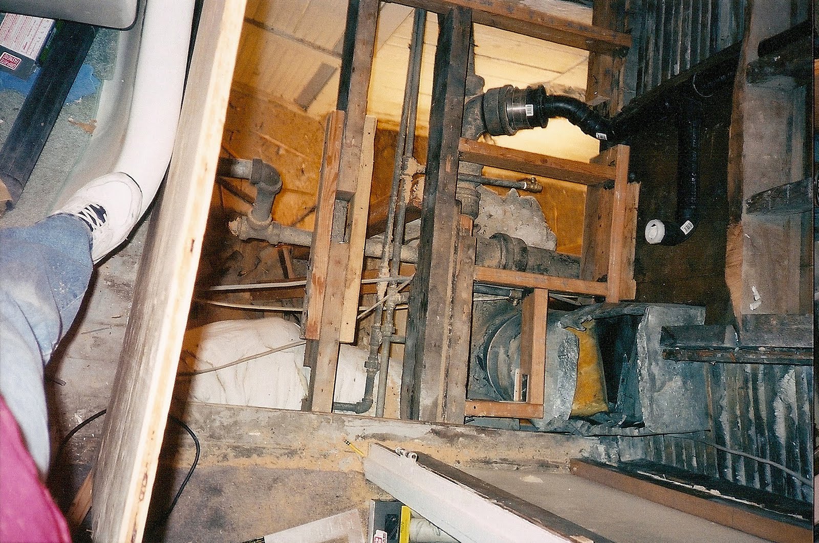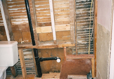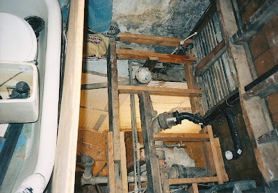 Well, when I got the vinyl up, I saw that they had patched a section of the floor just around the toilet with plywood, and it was sinking. A closer look in the cellar revealed that when they replaced that section of the floor, they cut come joists. Basically, our whole bathroom floor was being supported by nothing but the plumbing! Oh and by the way, this was our only bathroom.
