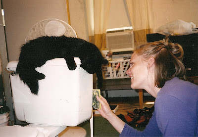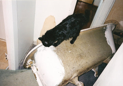 While the toilet was out I took the opportunity to get all the pink paint off, and Kitty helped. What a mess!