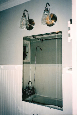 Last we put in a very small pedestal sink, the mirror, lights and some storage shelves. Presto whammo! After about 9 months…. we finally finished! (the reason we did a small pedestal was the small size of the room only 6′ x 5′ tiny, especially with the huge -but awesome- claw foot tub!)