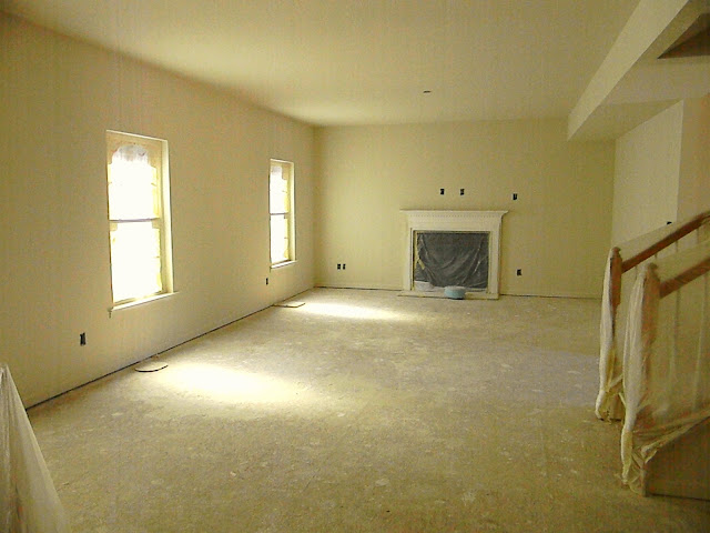 Everything was sprayed beige, even the ceilings, when we moved in. We opted to not have windows on either side of the fire place so that we could have a large built in from wall to wall. The window frames were knocked out to allow for really nice finished off framed out windows!