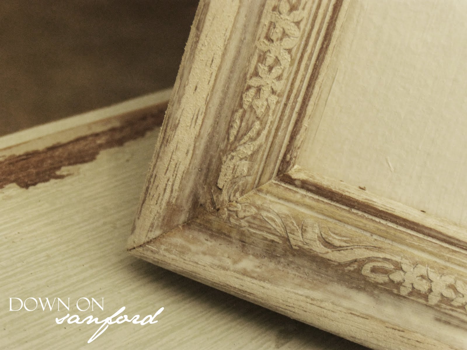 I’m really thrilled with how this frame came out. I forgot to take a before picture (doh!) but it did have a nasty gold finish, pink matting and a grandma-ish flower picture. I sanded it down, and then washed it with white paint. I think all the little details are awesome, and the washing really made them stand out.