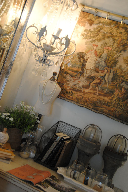 Hubby hung a small prism chandy from the shoppe inside…..it makes the perfect reading light.
