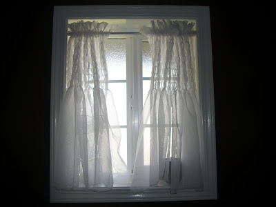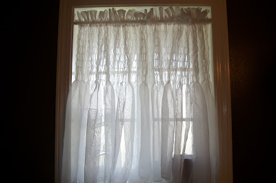 Here I could have stopped and left it like this but I wanted a more full look so I shirred some more rows at the top of the curtain, for a total of nine shirred rows. Then I cut the curtain in half and shirred the bottom end another 9 rows and used both ends of the panel to fill up the window.