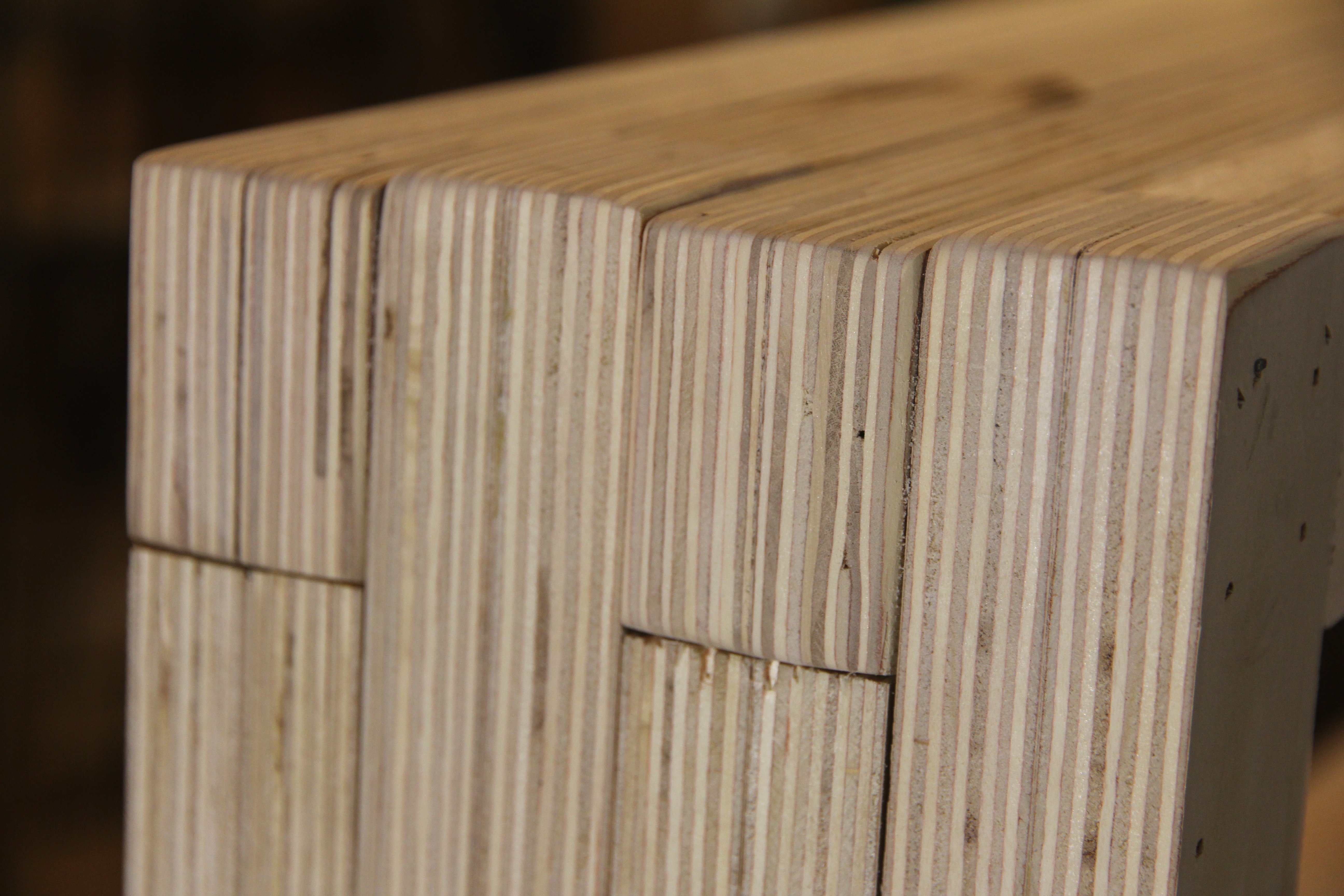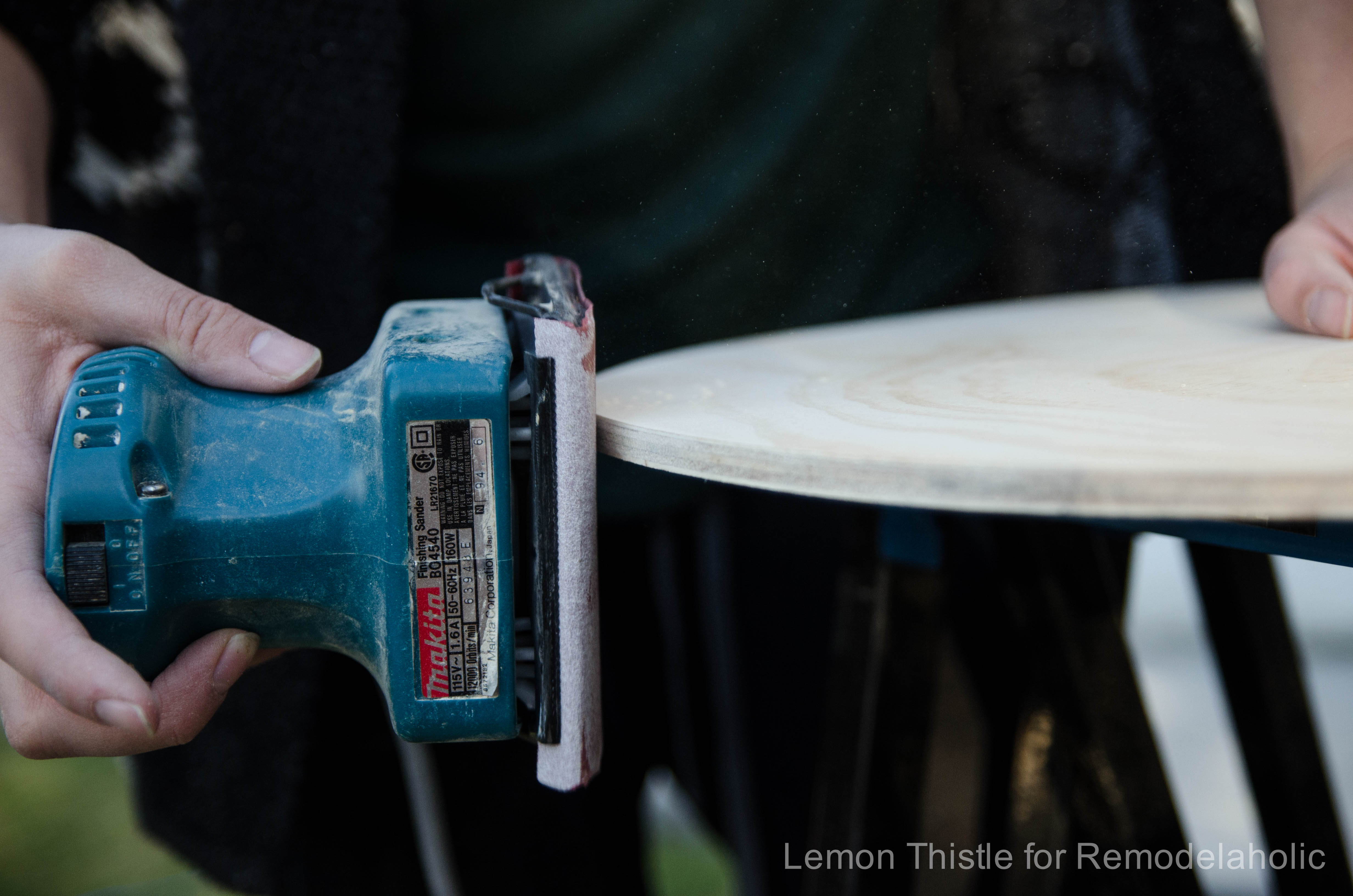 Because of how plywood is created, you must be very careful when sanding. As Blaine advises, it is very easy to sand through the top veneer and cause what is called a “burn” where the second darker layer shows through. On the flipside of that, you can achieve some interesting effects by creatively “burning” the plywood and sanding through multiple layers. Plywood is layered with alternating grains and usually alternating tones, so aggressively sanding can give you a more creative finish. However, if you want a smooth and even finish, without color variation, make a couple of light pencil marks to serve as a guide to your sanding.