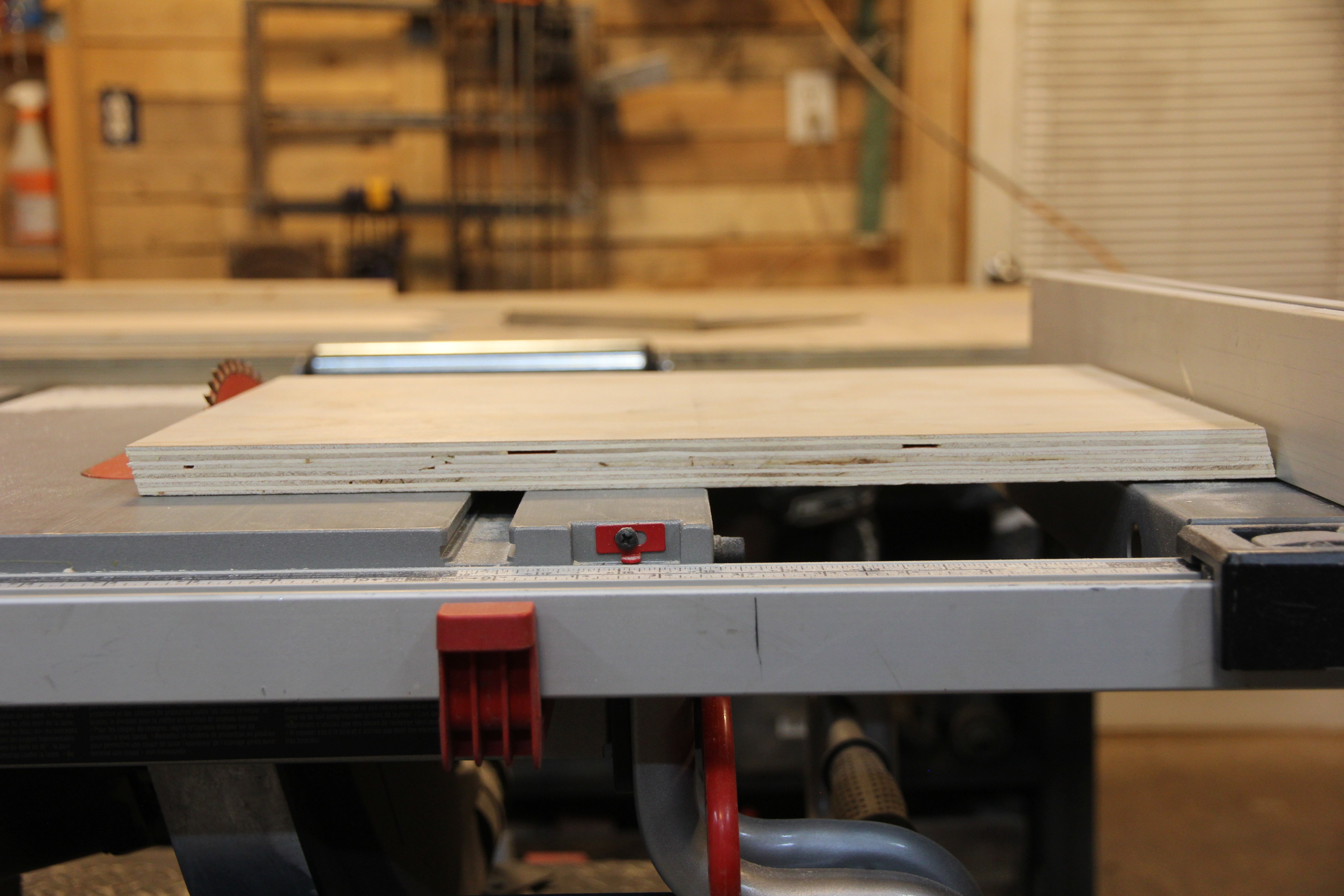 When you’re using a circular saw, the blade cuts UP, so you’ll want your plywood face DOWN. A table saw works the opposite way — it cuts DOWN, so you’ll want your plywood face (or what will be the top of the project) UP.