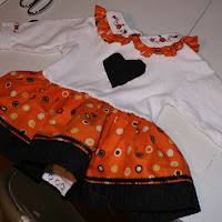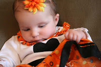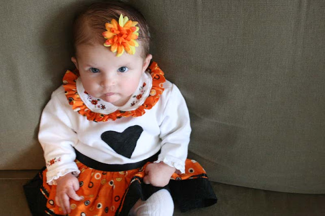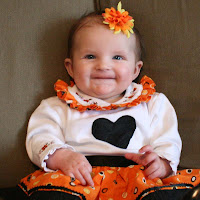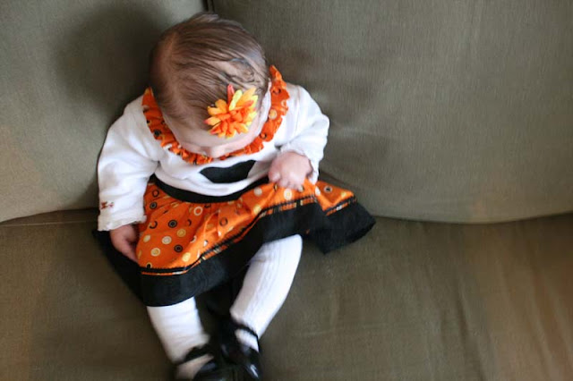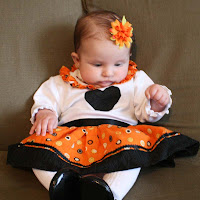>Could she be any cuter!? Very cute dress. I wish we were near enough to give her some of her first Halloween candy. Of course it would be your candy because she's not big enough for all the other good stuff out there. I love free candy!!! And I've got five little trick-or-treaters working for me so I should make out pretty well this year.
