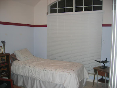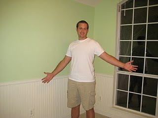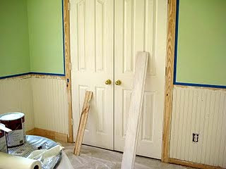 The summer before I got pregnant, we decided to start ‘remodeling’ the room so it could still be a guest bedroom but also ready to be a nursery when we needed it. We took off the chair rail, baseboards, and trim around the doors and replaced it with wider baseboards and prettier trim. That was not fun since most of the walls weren’t straight so Brad had some choice words when trying to get the baseboards up! We also added beadboard which was also a not-so-fun project since you had to nail each indvidual piece to the wall. Talk about major headache! After going back and putting wood putty over all the nails and sanding, we were able to paint the trim and beadboard an off white color.