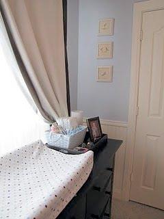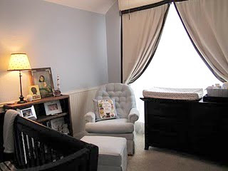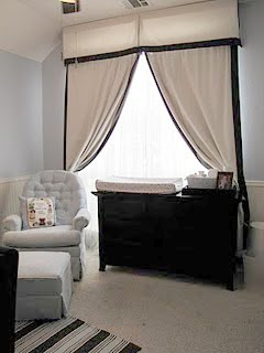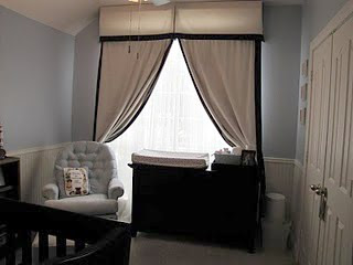 My biggest issue with the room was the window. The window is huge and is rounded at the top which made buying anything pre-made very difficult…and expensive. Also, since the window is so long, it was hard to find long enough drapes. My sister helped me take pre-made drapes from Restoration Hardware and make them look more custom-made. Even though they were a tad pricey, I love the drapes because they are a neutral color and are black-out lined which is perfect for a baby’s room. And actually, these drapes aren’t quite long enough, but we were able to hide that fact with the ‘custom’ valence. Brad made a box out of wood (that my sister designed and gave custom measurements for) and hung it from the ceiling. Then my sister and I used the premade valance to staple it to the box, creating a box pleat in the front. I love that it wraps around the drapery panels and it makes the window look so big! We also later hung sheers behind the panels going across the window for when I want to pull back the drapes to let light in. Those sheers are super cheap from IKEA, but also are not very pretty. 🙂 Oh well- no one will be examining my sheers anytime soon!