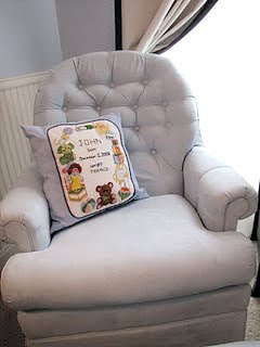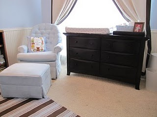 Throw in a crib, dresser, super awesome swivel rocker chair, rug, bookshelf, special artwork from grandpa, and some garage sale prints and you have yourself a nursery! I love how the room turned out and am sad that John is already old enough to need a new room!
