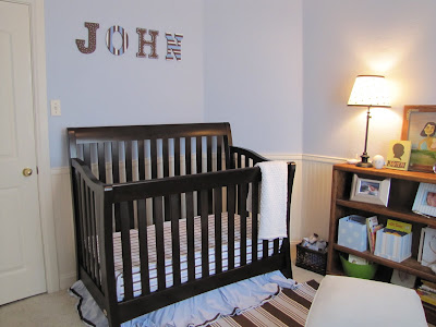 For the wall above John’s crib, I got letters from Michael’s and painted them to match John’s room. Of course, after I painted them, I started entering the blog world and read how to decorate letters using scrapbook paper and modgepodge which probably would have been way cuter than how my letters turned out!