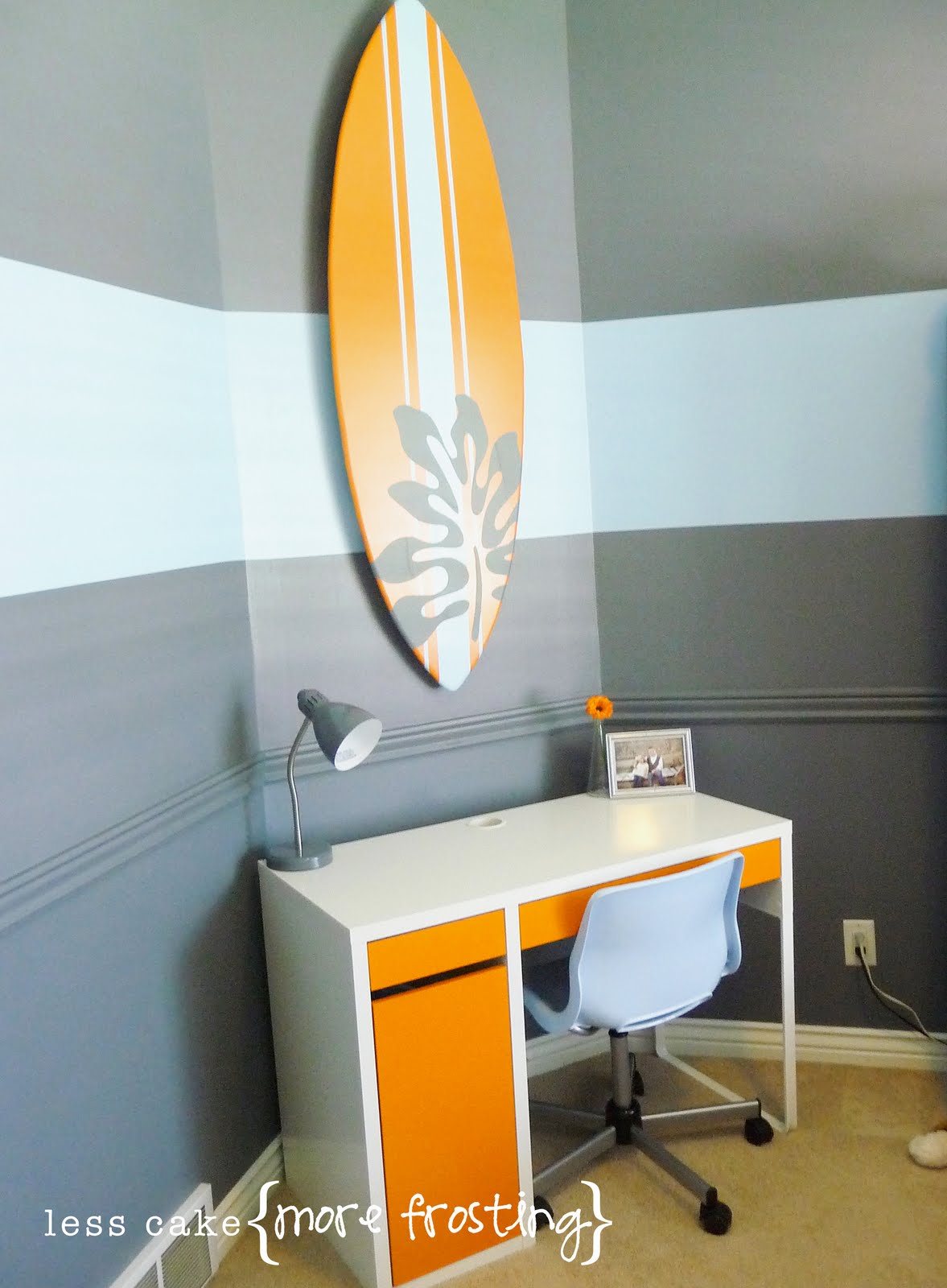 We wanted a modern/surfer theme. It was a color palette that my son had agreed to liking. Originally we had toyed with super-heros and other things that he’s really interested in. But we decided to just pick a “color theme” and go from there instead. This certainly wouldn’t be exclusive to surfing. So we feel it could grow with him. Or even change to a new child, if that’s ever necessary.
