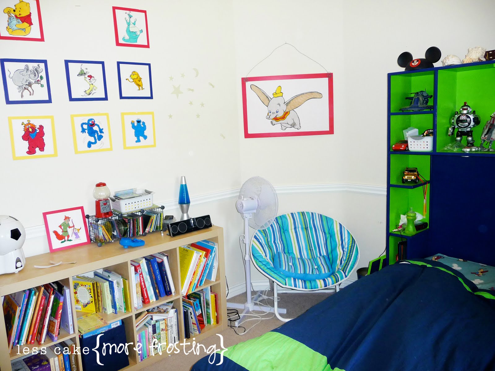 I thought, at the time, that I’d change the bedroom into a “buzz lightyear” palette of lime and navy. So I painted the bed those colors, and made a duvet cover and curtains to match. However, we soon learned that my son couldn’t handle the disposal of ALL of his favorite things. He pretty much lost it over the bed switch. And the thought of losing all his treasured pictures was just too much for him.