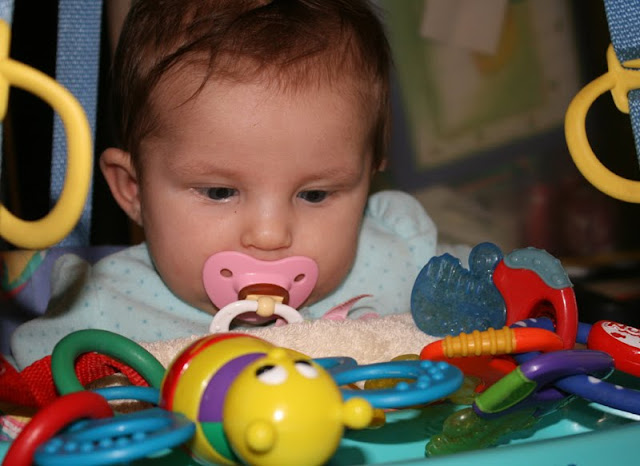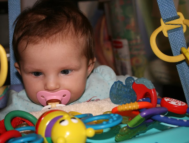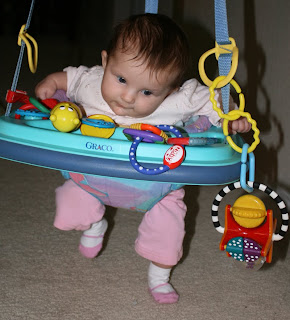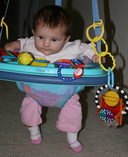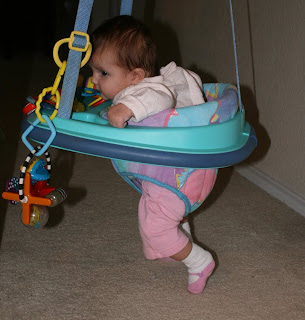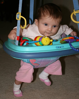 Etta is still pretty little, (not quite 3 months) but she is strong. So ,the other day I thought I would try out the Johnny Jumper. She loved it. She mostly just looked at her toys, but it was so cute! It is nice to have some different options to try out when they need a change.