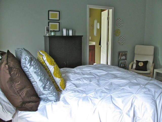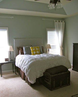 The paint color seriously looked like poop. This was also the color of our kitchen (who wants their kitchen to look like poop?!). The kitchen is now wedgewood gray (which is actually more like a cheerful blue), and our bedroom also finally got a few coats (not coates:) of paint. I usually enjoy painting, but I was a little bit intimidated by our bedroom. It has tray ceilings, and there were a few cracks in the ceiling and dry wall nails that had popped through, so we decided to hire a professional to do the work for us. Carl Wayne Meekins came to the rescue. He goes to our church and stays busy playing the guitar and singing and to my surprise, painting! We were happy to hire someone we knew and trusted to get the job done, and Carl Wayne did an amazing job. The cracks are all gone, and you would have never known they were there. The paint colors we chose were Comfort Gray on the walls and tray, and Rice Grain on the ceiling. They are both Sherwin Williams colors. I usually stick with Benjamin Moore and the Restoration Hardware colors, but I found out about these colors on one the blogs I read, Nesting Place, and so I decided to try them out. At first, I thought it was a little too blue and not enough gray for my taste, but once the room was decorated, I was really really happy with the color! Here are some pictures with details of where I bought some of the items for our bedroom. We were able to do the whole thing pretty cheap with some DIY projects and cheap buys from my favorite, Ikea.