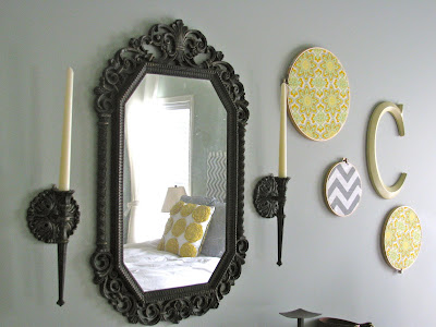 I also made a little arrangement with the quilting circles, a “C” I had from our wedding decor, and a cheap mirror I bought awhile back at the Spring Hill antique mall for less than $10.