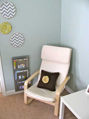 The circles on the wall are quilting circles that were only $1 a piece at Hobby Lobby. I just put the extra fabric in them I had left from my headboard and some other fabric I already had and hung them on the wall. So cheap and easy!! I am going to add a lamp to this corner and maybe even a foot rest if I can find one for a good price. I also made the flower on the pillow with a little (a lot) of hot glue and glued it right on the pillow.