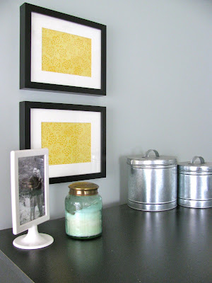 I bought some black frames from IKEA for $7 a piece and put yellow scrapbook paper in them that I already had. I also got the cute white frame from Ikea for a whopping 99 cents and I found the metal tins at Kroger on clearance. I can’t remember how much… I just know they were cheap. The candle is from Anthro… a gift from my good friend Kristen. It smells amazing.