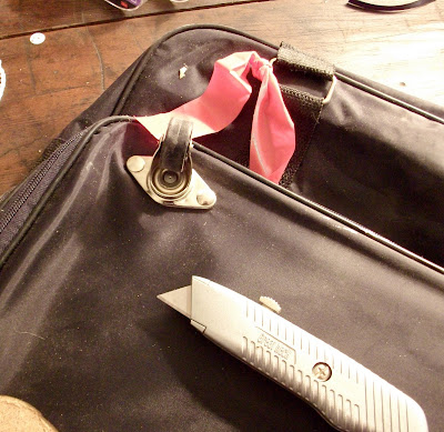 They were fastened to the suitcase with these little brads. I bent their tops and pulled them out.