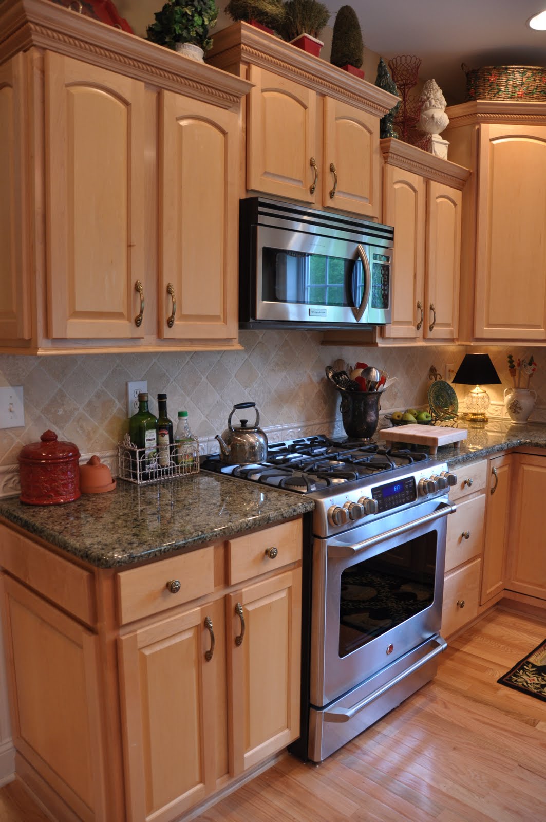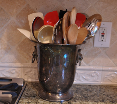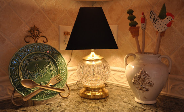 My crystal lamp on the kitchen counter is from Salvation Army. I found this beauty for $2.99 about 5 yrs ago and knew it was coming home with me! The plate, plate holder, fleur jar and rooster and topiary spoons all came from AJ Wright for next to nothing.