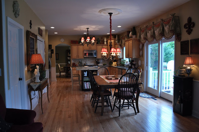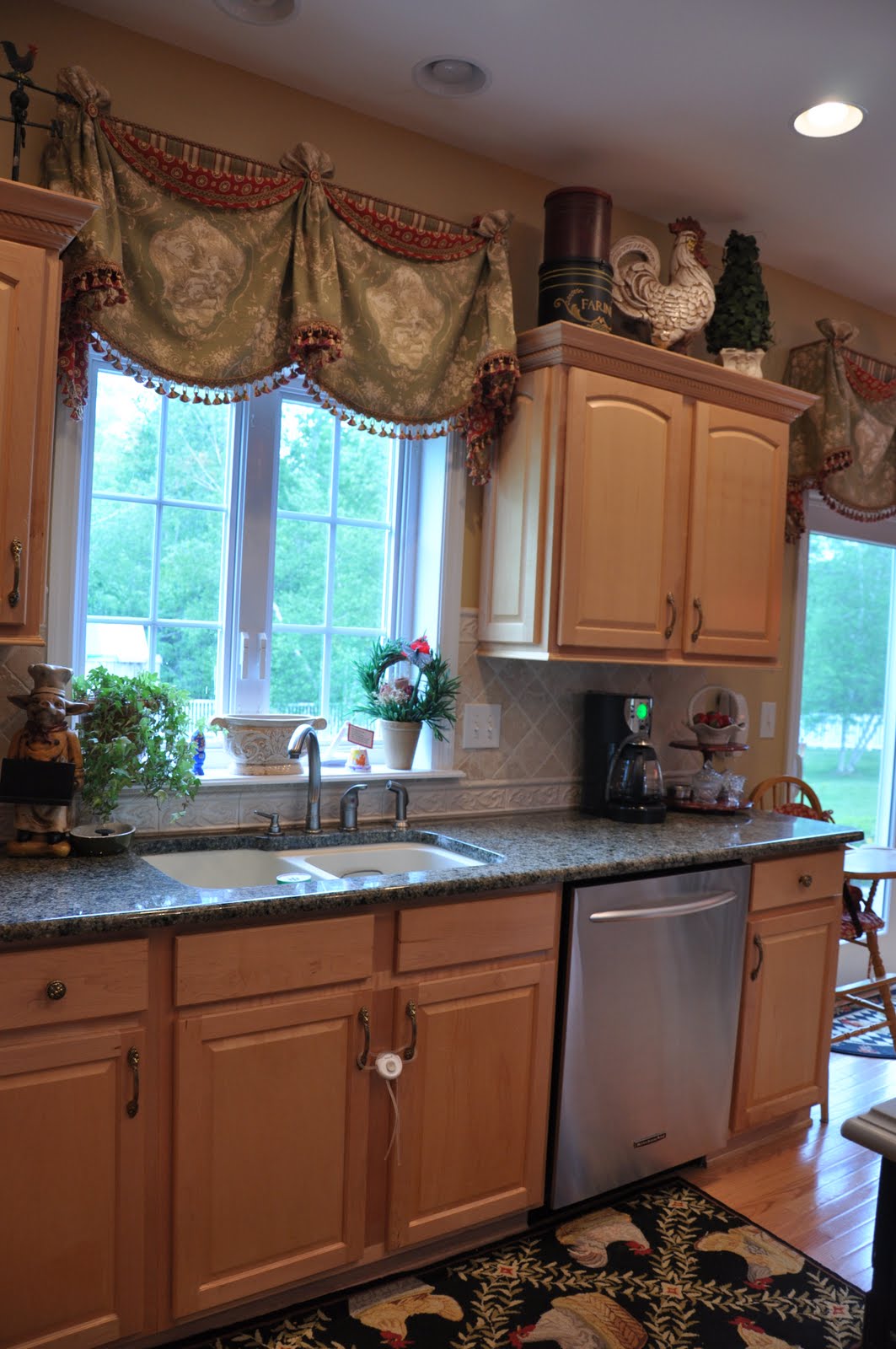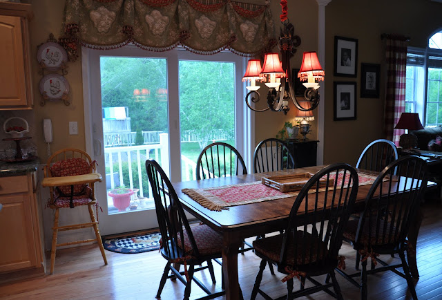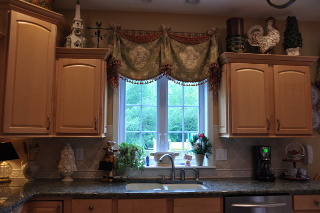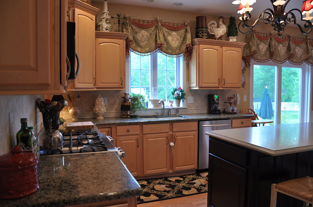 >You are a gal after my own heart! I LOVE french country as well and am still in the process of making our house into a french country home. Your kitchen turned out beautiful! My fave items are the treatments! Can I borrow your friend!?Ha! I also love you rooster cabinet you did! Truly inspirational! I just may have to do some decopaging myself. Can't wait to see you new home and yes paint is sooooo hard! I went thru literally almost 100 different sample colors before I ended up with Whole Wheat i the main part of the house, camelback in the kitchen and getting ready to do Ivorie in the dining room. All still a work in progress.