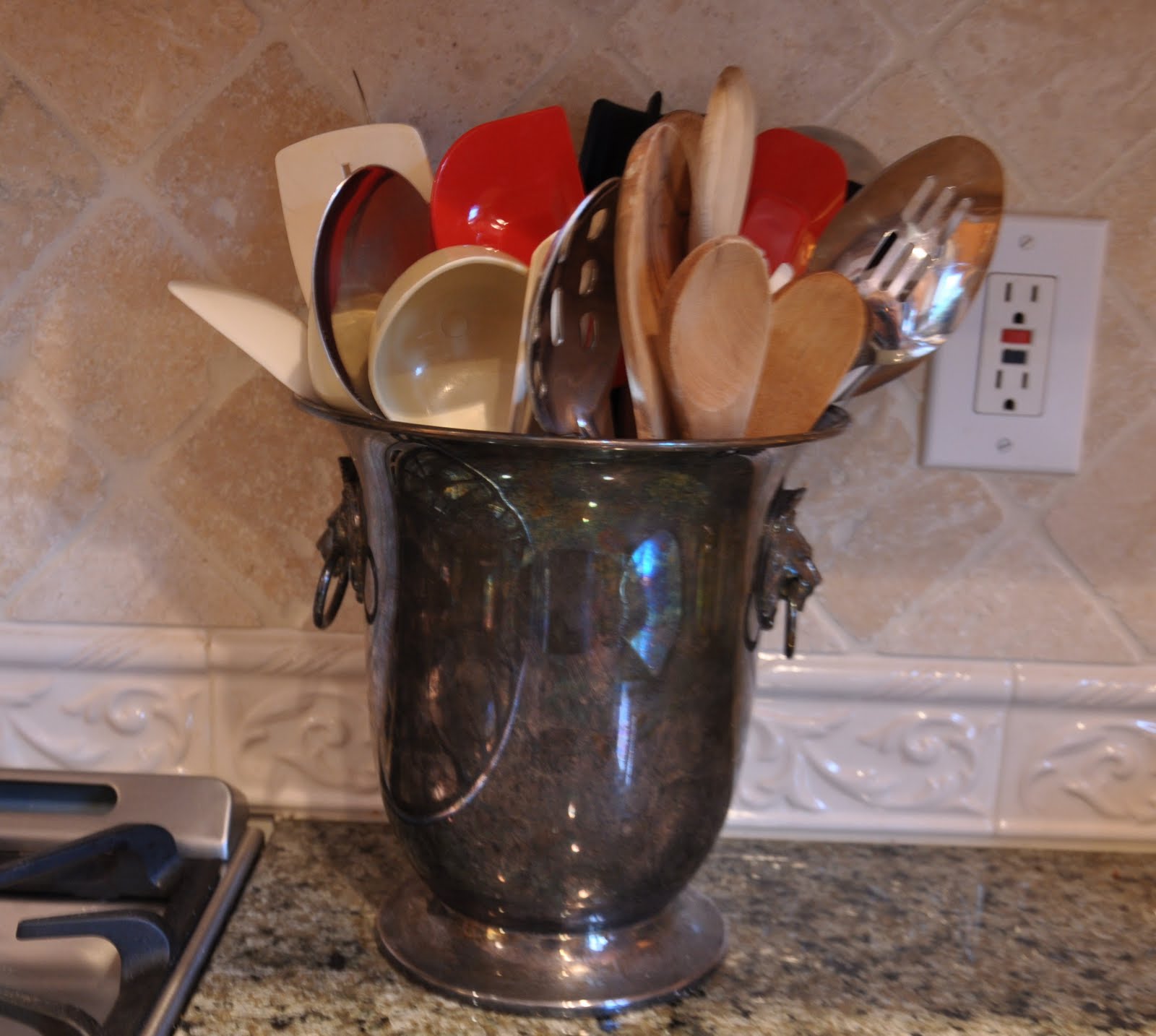 I got this silver bucket (I like it tarnished!) bucket with lion head sides at a thrift store in Florida and it fits all my junk in there nicely!