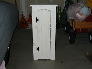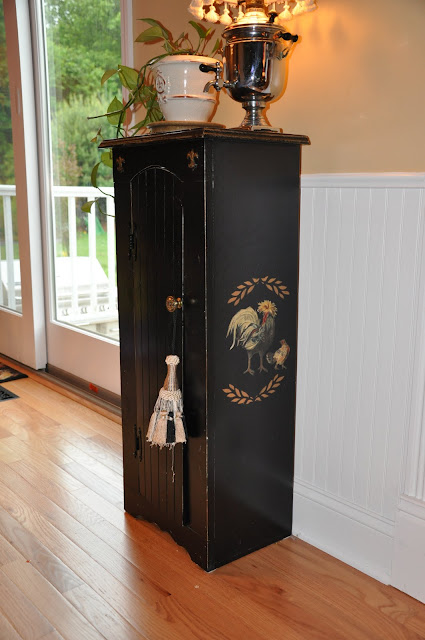 The jelly cabinet I found at Salvation Army for $8 and gave it a makeover. I added the wood fleur de lis and then painted it black and decoupaged some roosters that were scraps from a wallpaper border. I decoupaged some more on top and stenciled the big gold fleur on top. It was a very fun project! It holds my tablecloths and cloth napkins which we use everyday because I’m cheap it’s green! No throwing away paper napkins everyday!