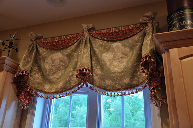 My window treatments were made by one of my good friends Kathleen! We met when our boys went to preschool together. She made all her own curtains and valances in her own home. Someone walked into her house and said you should go into business and she did! Her husband made her a real work table and workroom in her basement. She is a fantastic seamstress! I had all the fabrics ( I have a fabric buying sickness, lol my basement is embarrassing!) and drew her a very pitiful picture of what I thought I wanted and she made it EXACTLY! Her and I always joke that someday we’ll go into business together. She likes the fabrics I pick and admits she would NEVER think to put what I put together, but then likes the end result, lol. I have mostly ready-made curtains in my house (because I have a sewing machine and don’t know how to sew!) but splurged in this room! She also made me some london valances in my LR that I will show another day.