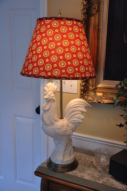 My rooster lamp came from the City Mission for $2. My mother found this one for me, she KNEW I would LOVE IT and she was right! Thanks mom! I found the lampshade on eBay, which is the exact fabric used in the rest of the room. They had an auction of 5 lampshades with this one included and when the lot didn’t sell, the seller sold me this one for $3 plus shipping. Another fun find!
